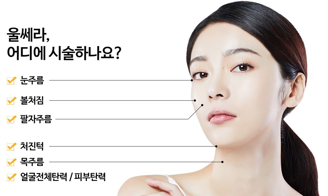 안면 리프팅에 대한 효과로 FDA 승인을 받은 최초의 장비입니다. 울쎄라란 고강도 초점식 초음파 수술기(HIFU, High Intensity Focused Ultrasound System)입니다. 돋보기 렌즈로 햇빛을 한 점에 모아 종이를 태우는 원리와 마찬가지로 초음파를 한 곳에 집중 시켜 열을 발생 시키는 장비입니다.